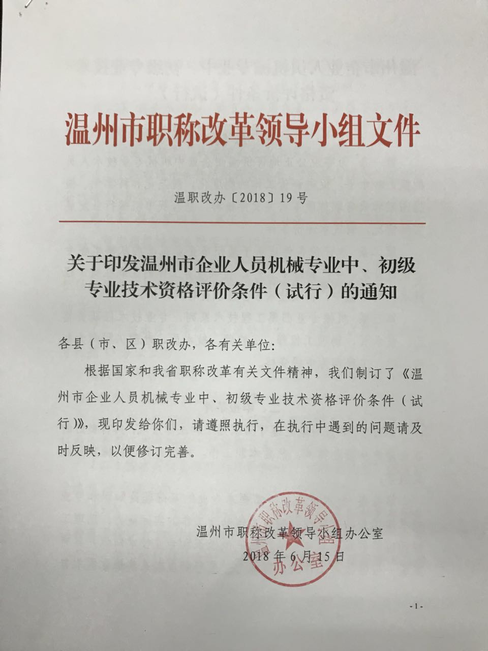 溫職改辦〔2018〕19號關(guān)于印發(fā)溫州市企業(yè)人員機械專業(yè)中、初級專業(yè)技術(shù)資格評價條件(試行)的通知
